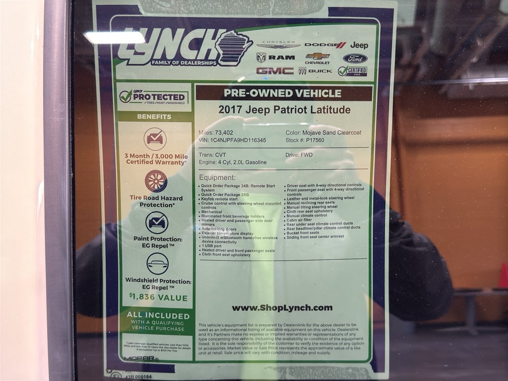 Located in Burlington, WI, this Jeep Patriot Latitude represents the best price in the area for a clean, feature-equipped compact SUV. If you're seeking a reliable, affordable ride with useful technology and a verifiable history, this 2017 Jeep Patriot is an excellent choice. Contact the dealership for availability and to schedule a test drive.