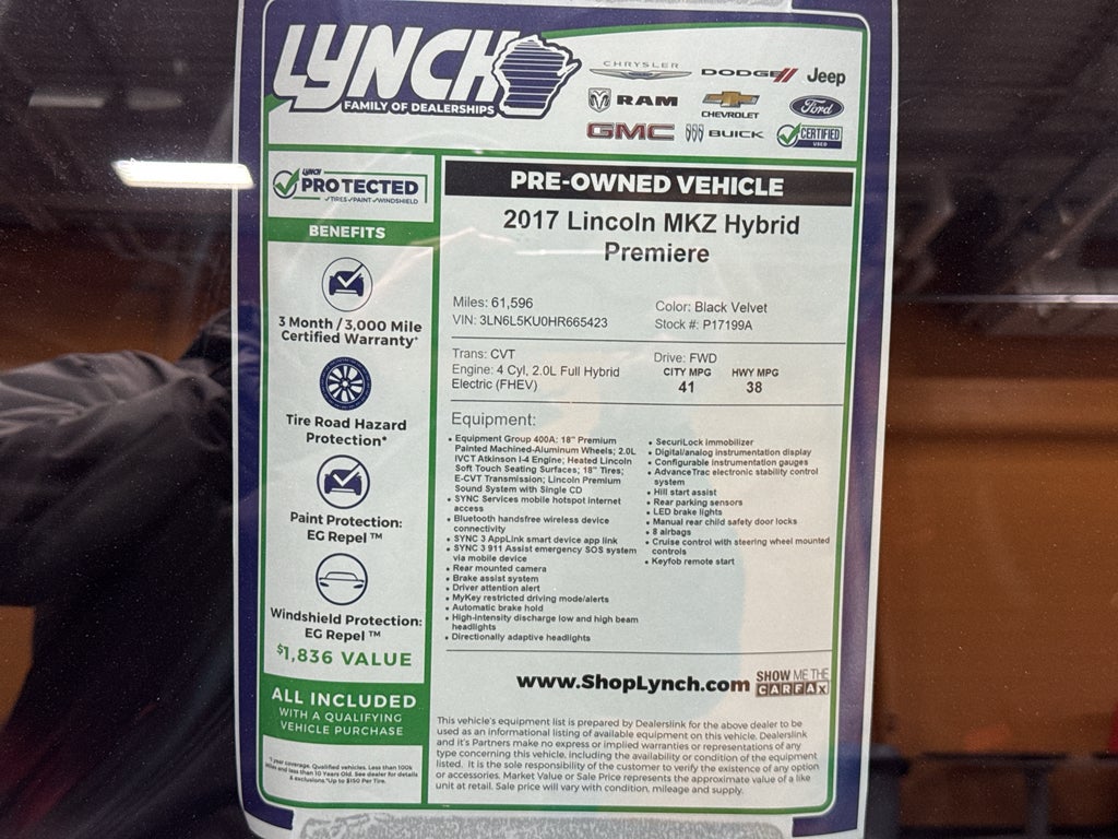 This Lincoln MKZ Hybrid Premiere blends sophisticated styling with advanced hybrid technology, offering an efficient and quiet driving experience ideal for daily routes or longer trips from Burlington and beyond. With a competitive price and exceptional value, this vehicle represents the best price on a refined hybrid sedan in the area. Don't miss the chance to own a luxurious, fuel-efficient Lincoln MKZ Hybrid that balances technology, comfort, and savings. Contact us to schedule a test drive and see why this 2017 Lincoln MKZ Hybrid Premiere is the smart choice for Burlington, WI drivers seeking top value.