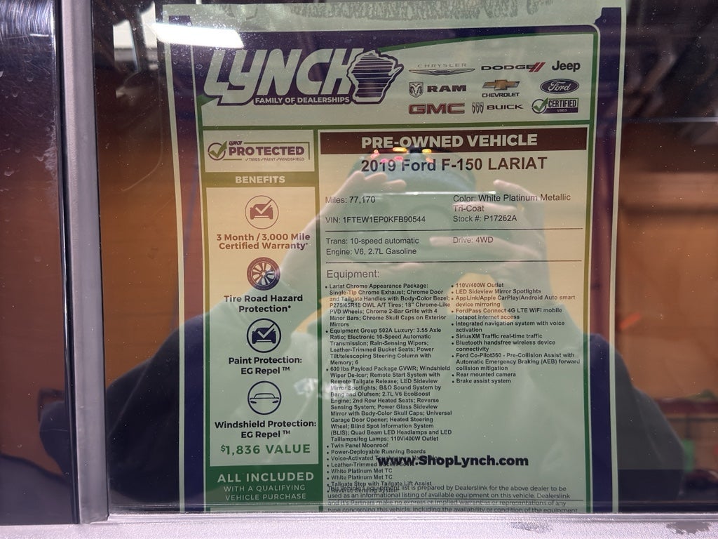 This 2019 Ford F-150 LARIAT is the ideal pick for drivers seeking a luxurious, work-ready full-size pickup without the new-vehicle price. Located in Burlington, WI, and offered at the best price in the area, it's ready for immediate test drives. Don't miss the chance to own a high-value, well-equipped 4WD pickup with leather seating, heated seats, navigation, Cross-Traffic Alert, and Rear Parking Sensors — contact us today to schedule a viewing and secure this outstanding deal.