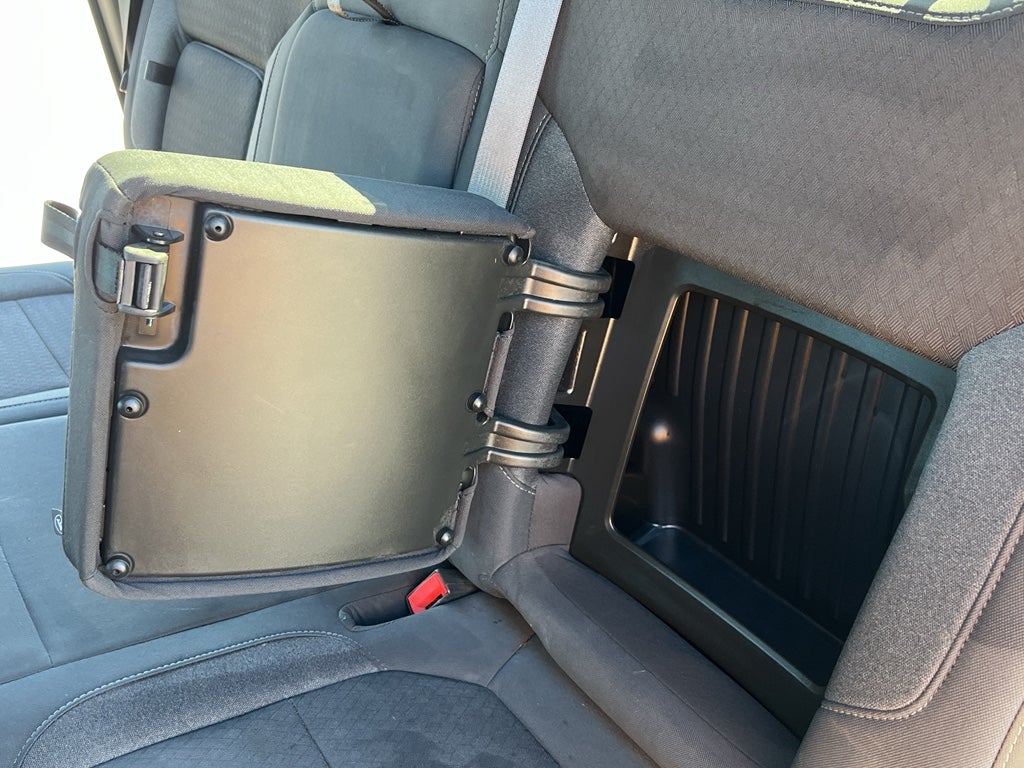 - Seat, Cloth Rear with Storage Package 60/40 folding bench for Crew Cab models, includes seatback storage on left and right side, center fold out armrest with 2 cupholders, (includes child seat top tether anchor)
