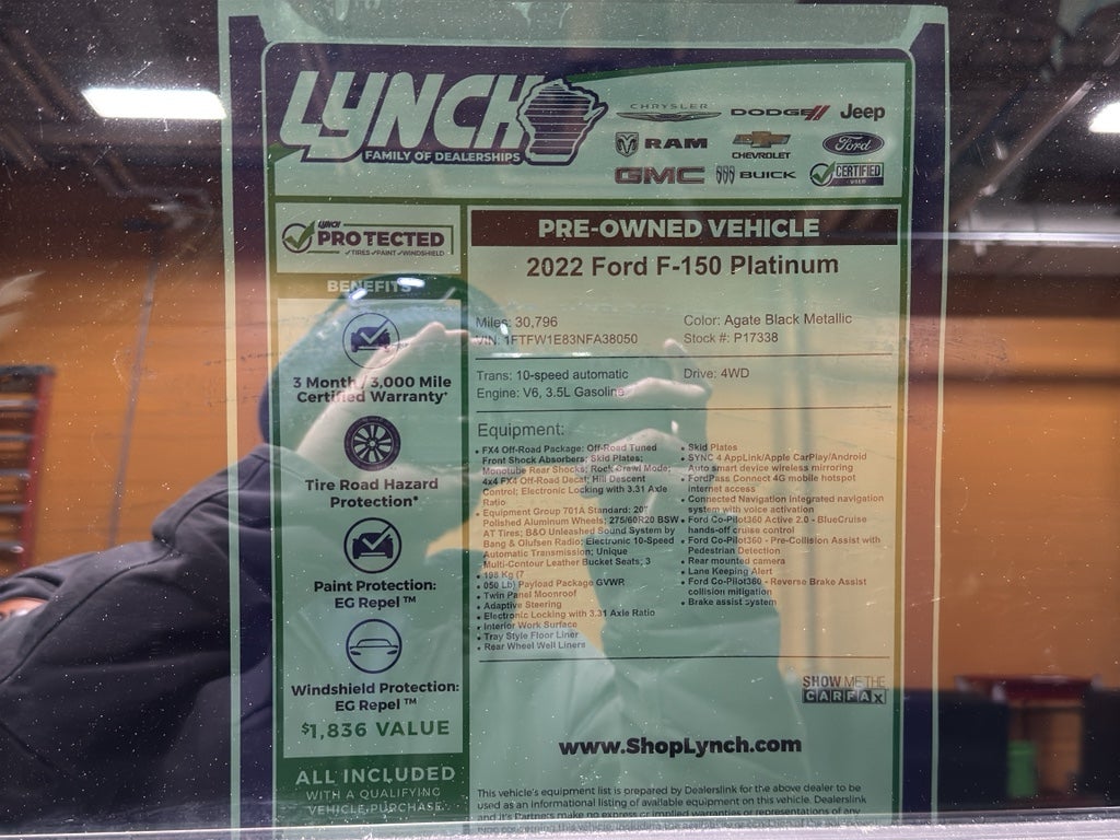 2022 Ford F-150 Platinum — 4WD, V6 3.5L, 30,796 miles — Burlington, WI. This premium pickup combines rugged capability with refined comfort, and it's priced to move. Equipped with a powerful and efficient 3.5L V6 gasoline engine and four-wheel drive, this Ford F-150 Platinum delivers confident towing, trail-ready traction, and smooth highway performance. With only 30,796 miles, it's an excellent value for drivers who want long-lasting reliability.