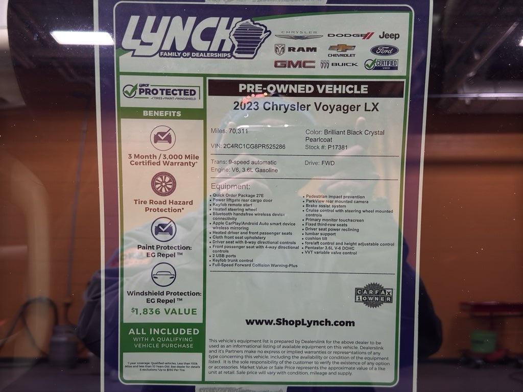 Bluetooth® technology is built into this model, keeping your hands on the steering wheel and your focus on the road. Never get into a cold vehicle again with the remote start feature on this vehicle. This vehicle's Forward Collision Warning system alerts the driver to potential front-end collisions, enhancing safety. It keeps you comfortable with Auto Climate. This vehicle is a certified CARFAX 1-owner. See what's behind you with the back up camera on this mini van. Apple CarPlay: Seamless smartphone integration for the Chrysler Voyager - stay connected and entertained on the go! This Chrysler Voyager is pure luxury with a heated steering wheel. Our dealership has already run the CARFAX report and it is clean. A clean CARFAX is a great asset for resale value in the future. This mini van offers Android Auto for seamless smartphone integration. The vehicle is painted with a sleek and sophisticated black color.
