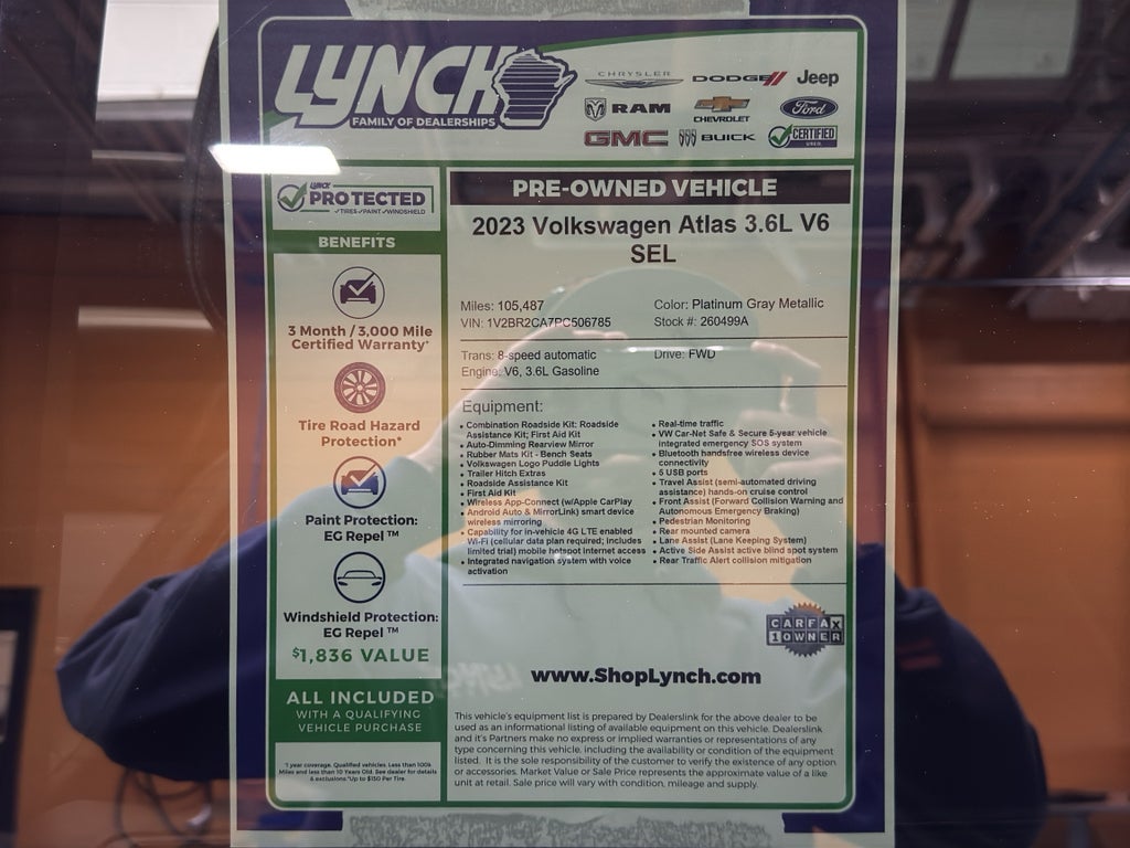 This unit is pure luxury with a heated steering wheel. This vehicle is a certified CARFAX 1-owner. This 1/2 ton suv has auto-adjust speed for safe following. Never get into a cold vehicle again with the remote start feature on this vehicle. The vehicle offers Apple CarPlay for seamless connectivity. This 2023 Volkswagen Atlas comes equipped with Android Auto for seamless smartphone integration on the road. This 1/2 ton suv's Forward Collision Warning system alerts the driver to potential front-end collisions, enhancing safety. You'll never again be lost in a crowded city or a country region with the navigation system on the vehicle. Bluetooth® technology is built into the vehicle, keeping your hands on the steering wheel and your focus on the road. Our dealership has already run the CARFAX report and it is clean. A clean CARFAX is a great asset for resale value in the future. See what's behind you with the back up camera on this unit.