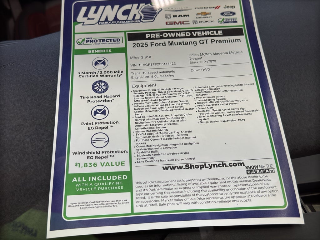 Experience thrilling performance with this 2025 Ford Mustang GT Premium, located in Burlington, WI. With just 2,910 miles, this low-mileage example pairs a legendary 5.0L V8 gasoline engine with rear-wheel drive for authentic Ford Mustang power and an engaging driving feel. The GT Premium trim elevates comfort and technology, featuring leather seats that frame a driver-focused cockpit and provide long-ride refinement.